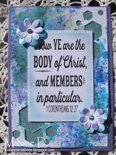 The elements were assembled over a strip of very sparkly blue sticky tape centered over the background, then mounted onto blue card,