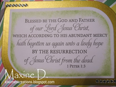 The front of the base I added some more red paper, the sentiment which was bronze heat embossed and coloured around after die cutting it, and some ribbon to slide the tag onto, and some more rhinestones. The molded, dimensional daisies were added with glue dots to prop the easel against.