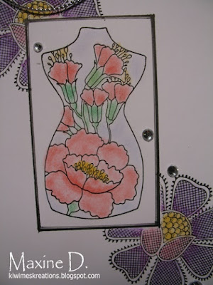 I then stamped the butterfly (from the Indigo Blue Wild Meadow stamp set) twice onto another snippet of white card, and coloured both the left wings with my PrismaColor pencils, and fussy cut them, including the body and one antenna, then glued one directly onto the paper, and the other one on top adhering it only on the body, and shaping the wing so it sat up slightly.